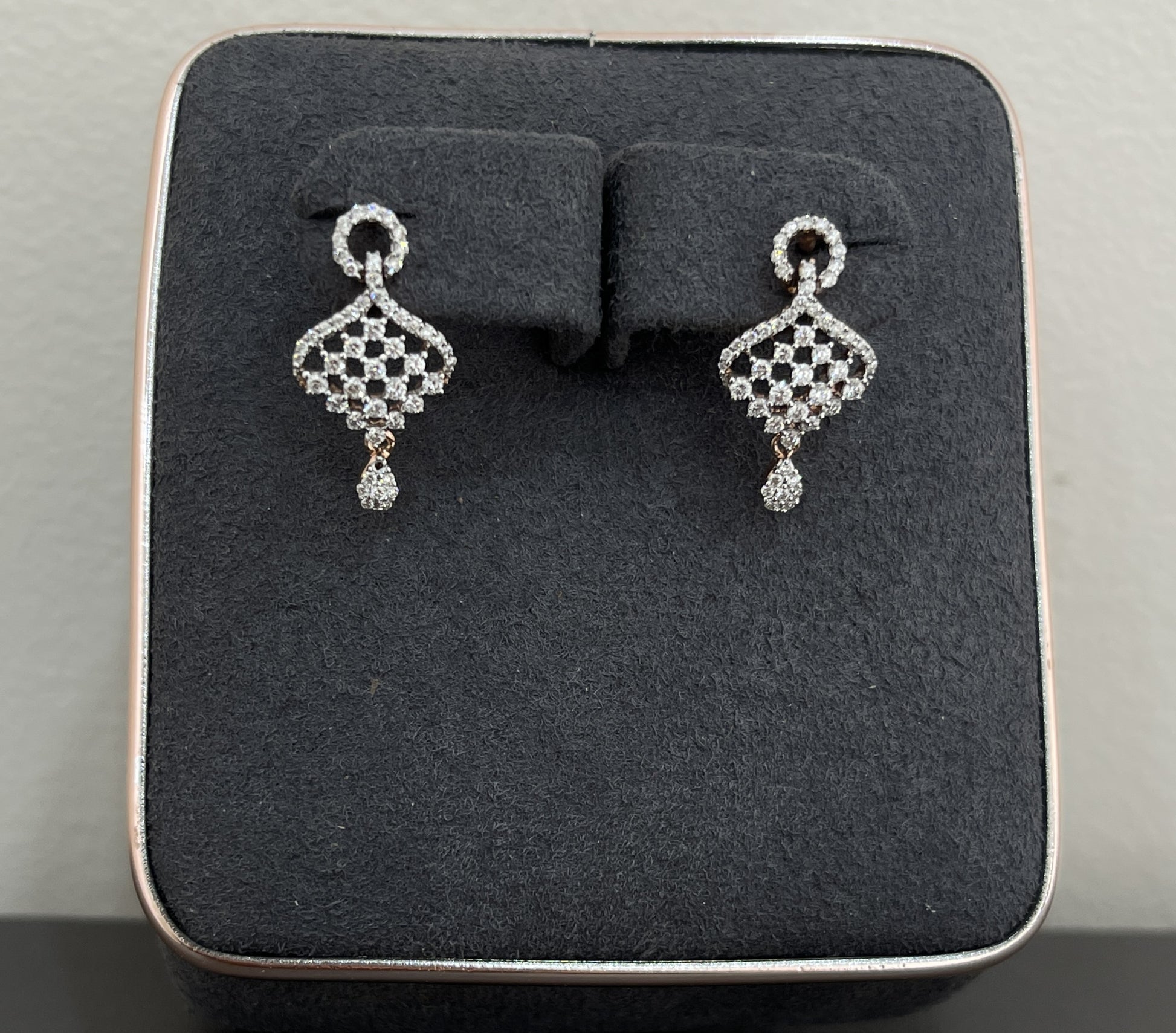 These exquisite 18Kt diamond earrings are crafted in a unique lattice-inspired design, perfectly blending modern elegance with timeless charm. The intricate checkered diamond setting is beautifully accented with a dangling solitaire-style diamond at the bottom, adding extra brilliance and movement. A perfect choice for festive wear, weddings, or evening occasions.