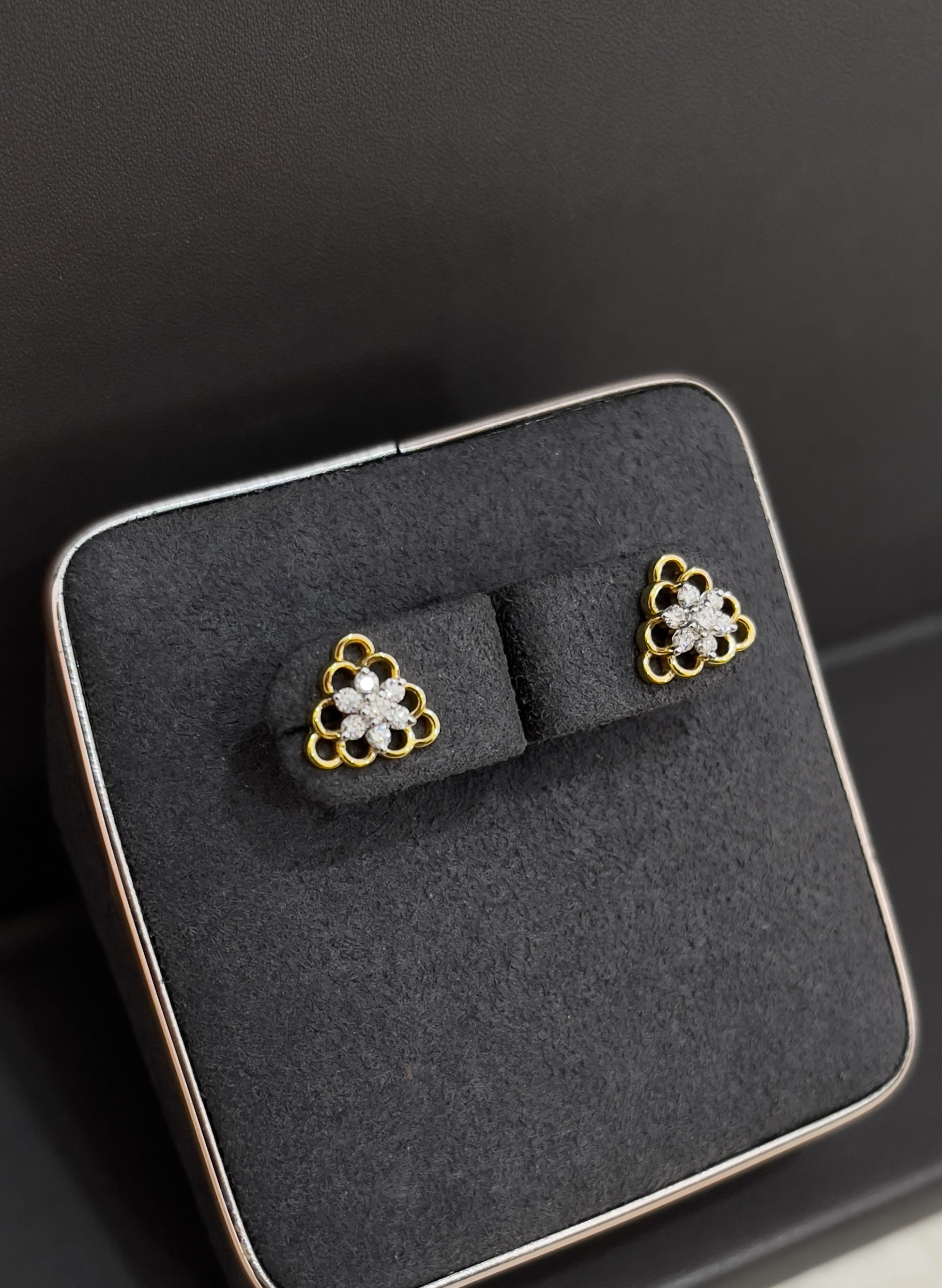 These elegant floral stud earrings feature a delicate cluster of sparkling VVS EF diamonds set in a graceful flower motif, outlined with a unique looped gold design. Crafted in 18Kt yellow gold, this timeless piece balances traditional charm with modern sophistication, making it perfect for everyday elegance or gifting.