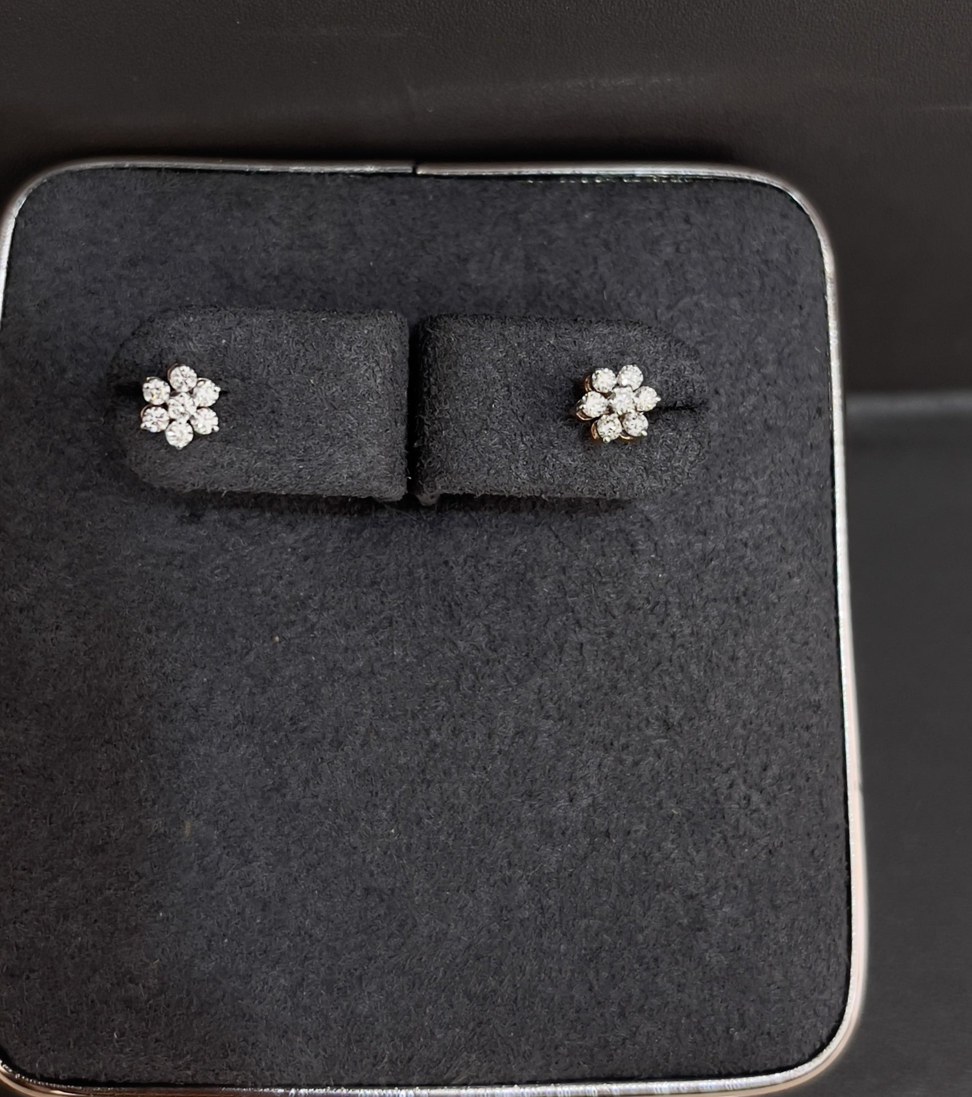 These charming stud earrings are designed in a classic floral motif, featuring a cluster of brilliant round VVS EF diamonds. Crafted in 18Kt yellow gold, the six-petal flower design radiates elegance and timeless beauty, making it a versatile accessory for everyday sophistication as well as special occasions.