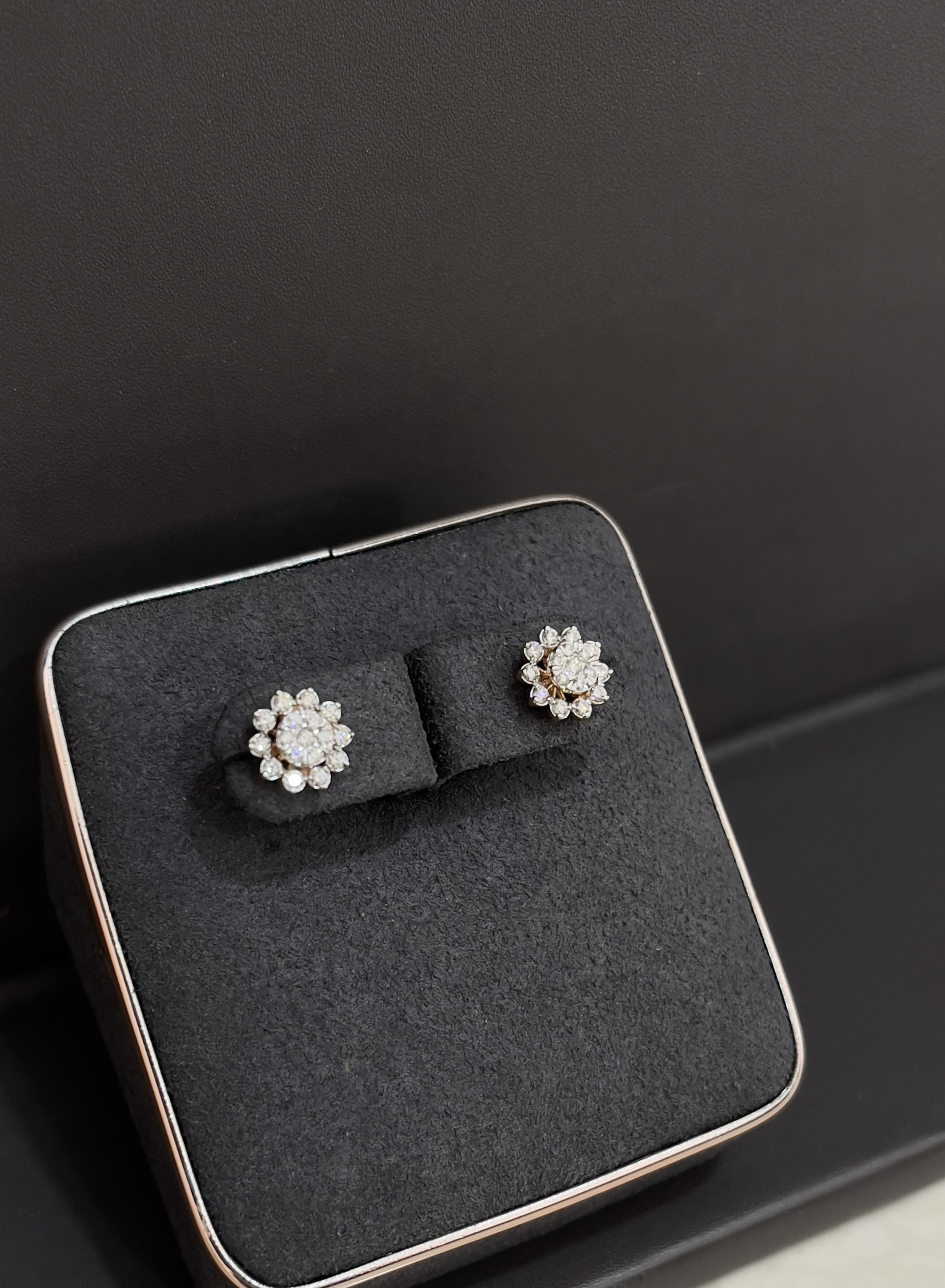 Radiating brilliance and sophistication, these 18Kt diamond stud earrings are designed in a stunning floral cluster style. Each earring features multiple round diamonds arranged to create a full-bloom effect, making them an ideal pick for both daily wear and special occasions. Their timeless charm and sparkling finish add a graceful touch to any look.