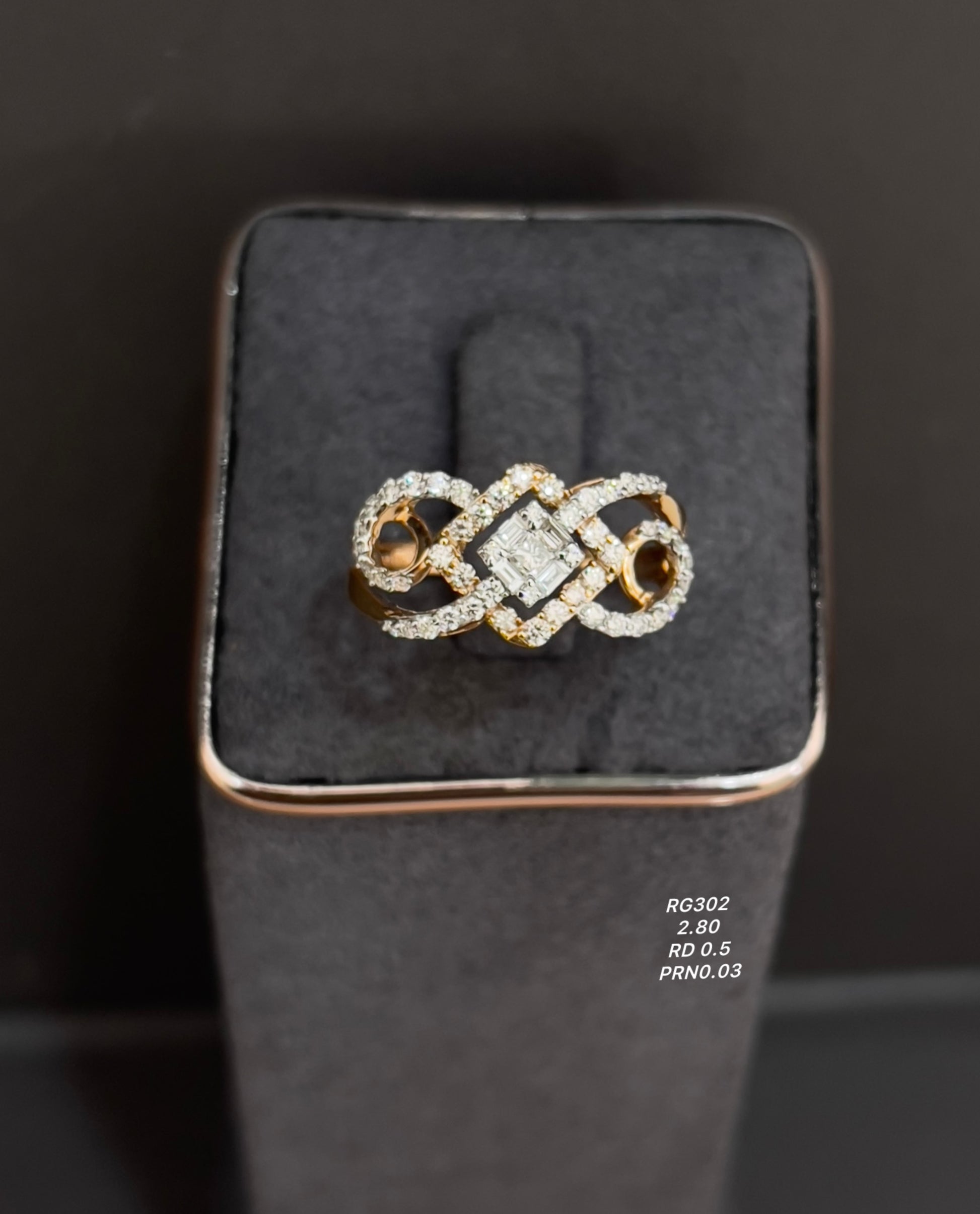 A timeless 18KT diamond ring featuring an exquisite design with intertwined loops surrounding a radiant square diamond cluster at the center. The intricate craftsmanship highlights the brilliance of VVS EF quality diamonds, creating a perfect balance of elegance and luxury. Ideal for both daily wear and special occasions, this piece exudes sophistication and sparkle.