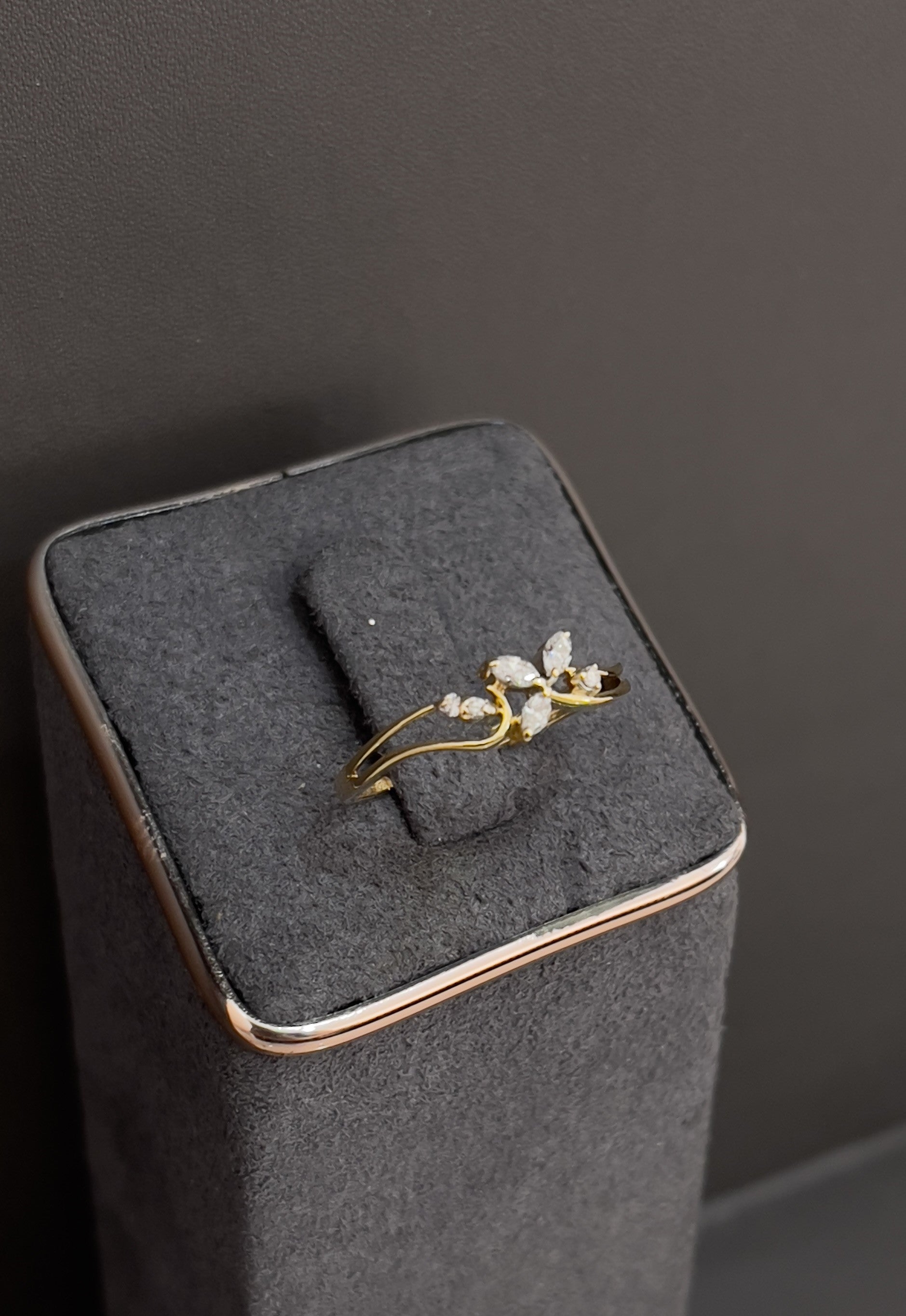 A delicate 18KT yellow gold ring featuring a nature-inspired floral design with sparkling marquise and round brilliant-cut diamonds. The twin-shank band adds elegance, making it perfect for daily wear or as a thoughtful gift. Each diamond is VVS EF grade, offering exceptional brilliance and clarity, and the ring comes with an IGI certification ensuring authenticity and quality.
